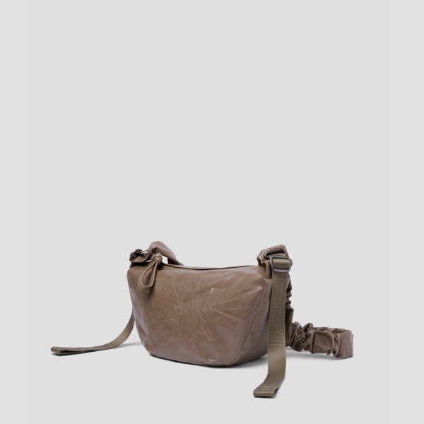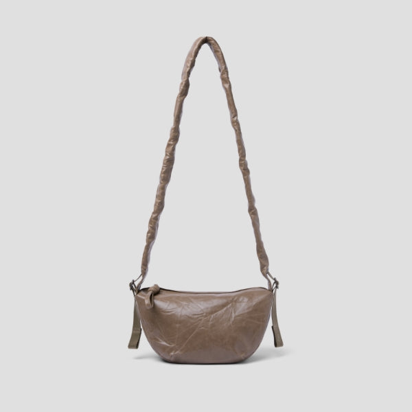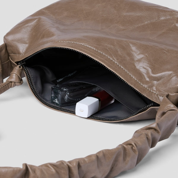 The Daily Shirring Bag, crafted from faux leather, is lightweight and features a charming, naturally wrinkled texture.