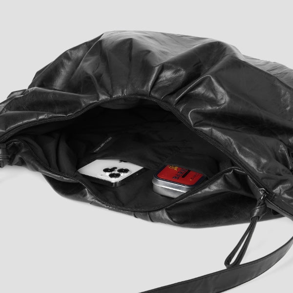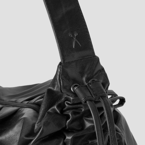 The Daily Wrinkle Bag, crafted from lightweight and soft vegan leather, features adjustable side shirring details that create unique and versatile silhouettes.