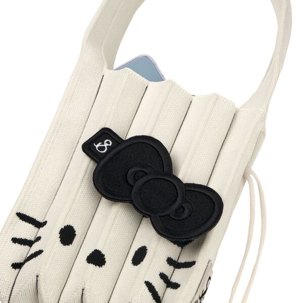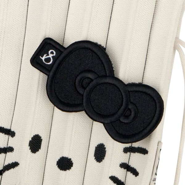 Featuring a matte black fabric with enhanced volume and texture, the embroidery and ribbon details bring Hello Kitty to life with added dimension, offering a charmingly unique take on the beloved character.