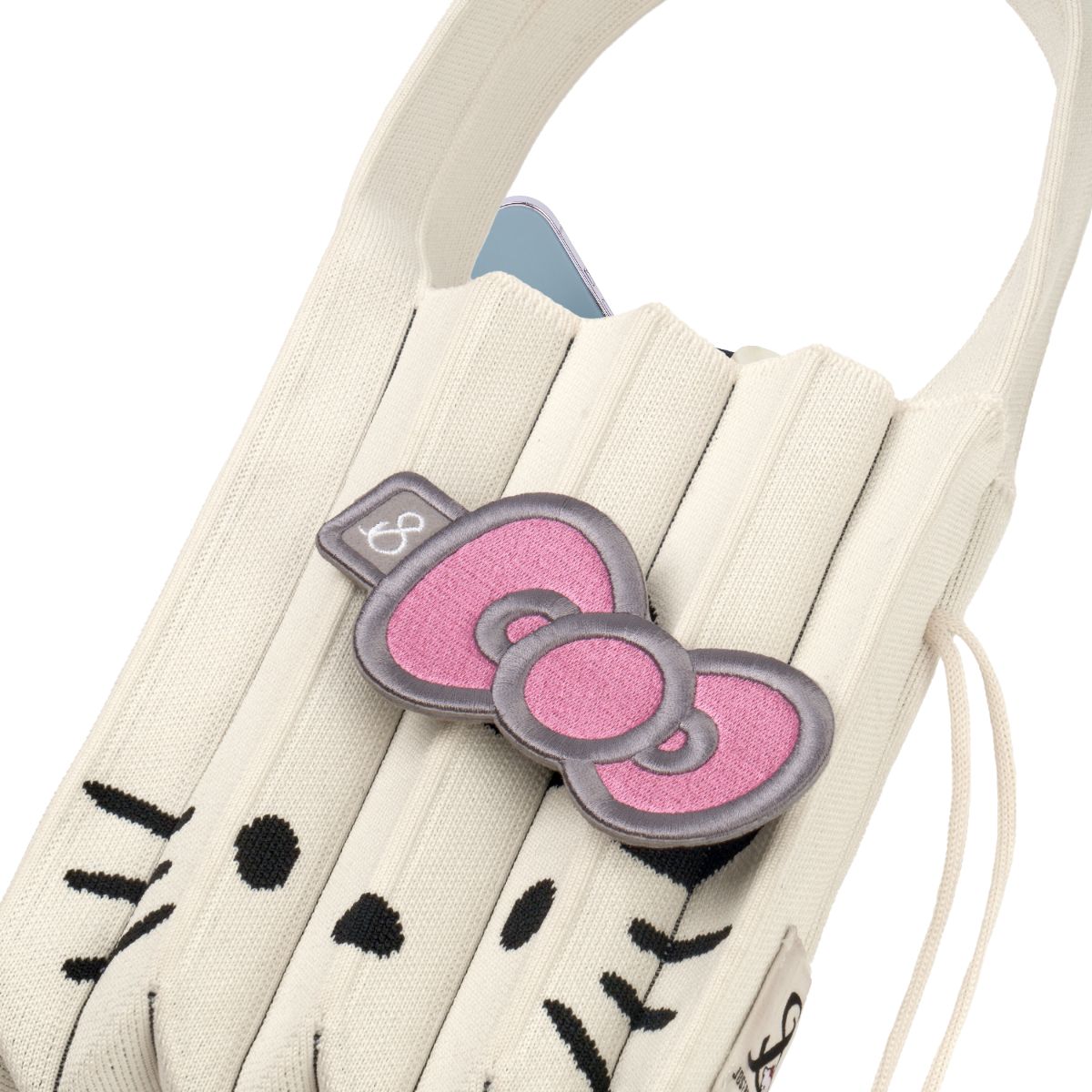 Featuring a matte black fabric with enhanced volume and texture, the embroidery and ribbon details bring Hello Kitty to life with added dimension, offering a charmingly unique take on the beloved character.