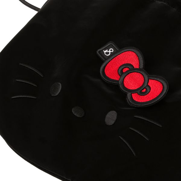 Featuring a matte black fabric with enhanced volume and texture, the embroidery and ribbon details bring Hello Kitty to life with added dimension, offering a charmingly unique take on the beloved character.